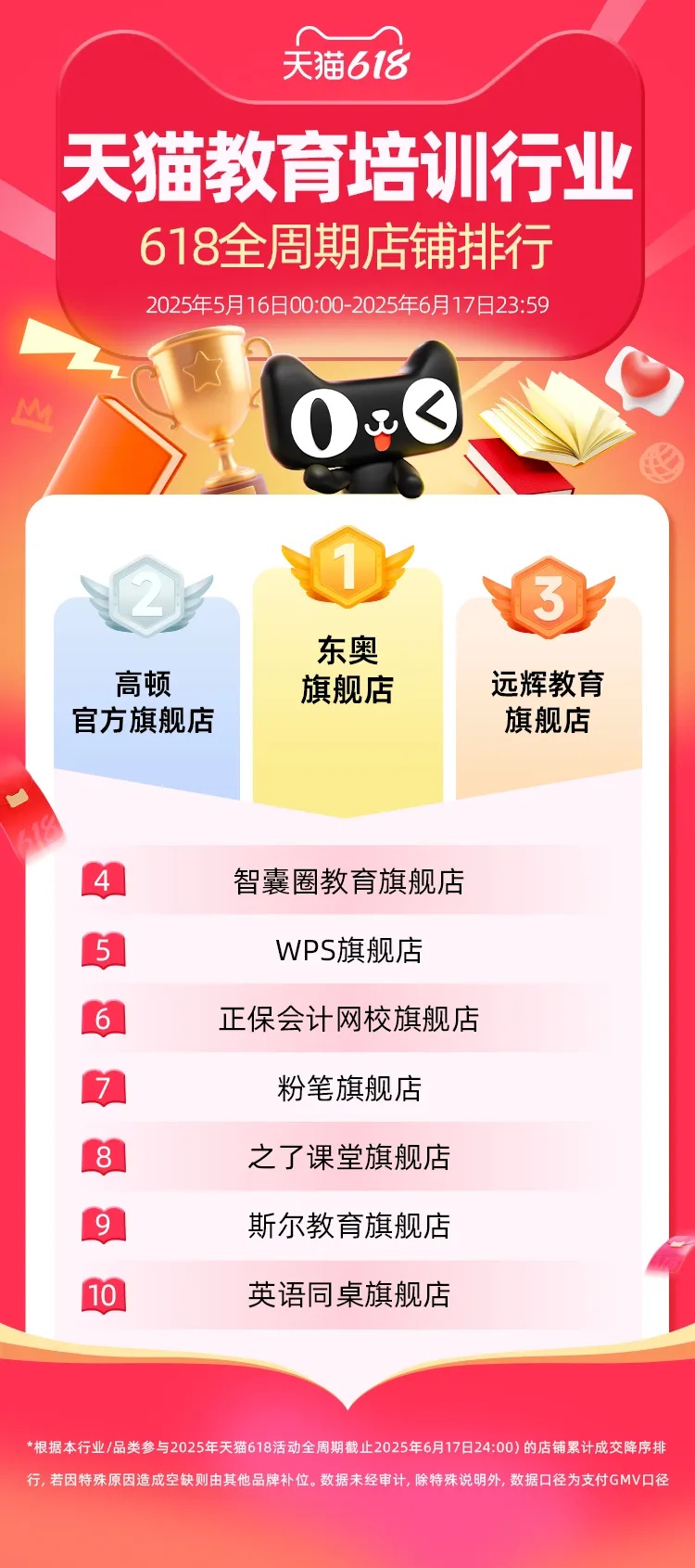在刚刚结束2025天猫618大促第一阶段,东奥旗舰店成交同比翻倍(103%),凭借其在注册会计师培训领域的优势,连续两年位列天猫教育品牌综合成交排行榜第一、财会培训赛道榜单第一。其中,店铺热销榜TOP1的《轻1·辅导教材书包课》就是采用了“教材+网课”模式。