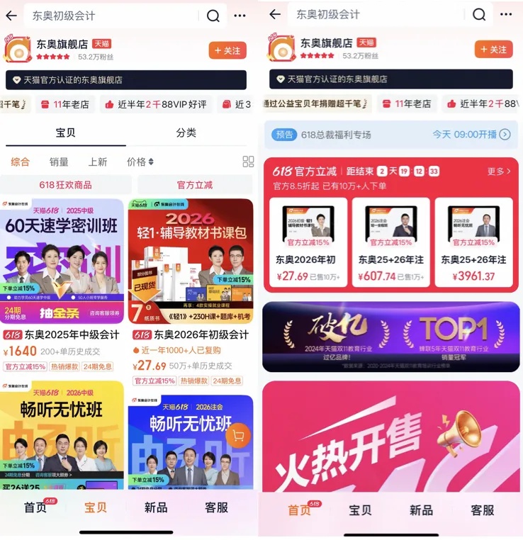 产品矩阵深化。基于会计考试与职业发展周期,东奥设计了从基础入门到高级进阶的全系列课程,并将其与相应的教材组合成 “书课包” 产品,为学员提供一站式学习解决方案。同时,配合天猫的限时折扣策略(如 618 期间的官方立减、9折无门槛券等),吸引学员购买课程,形成从流量到复购的商业闭环。